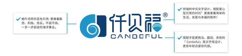 品牌識別的嶄新設(shè)計以「海洋」為主體,商標(biāo)的主體是福字型 海洋貝殼+中式文字的仟貝福+現(xiàn)代簡約英文Canbeful