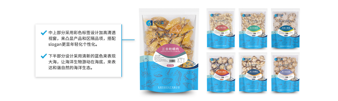 包裝的外觀設(shè)計主體為藍(lán)色海底色,搭配矢量寫實海洋生物,如同包裝內(nèi)的新鮮海鮮食材 ,傳達(dá)著自然、美味、安心的產(chǎn)品特色與信息。中上部的Slogan 凸顯出 專屬 個性化的體驗理念。從中央往外延伸出的雙拼色帶,則以青春,悅動的色彩表現(xiàn),作為各產(chǎn)品系列品項之間的區(qū)隔。